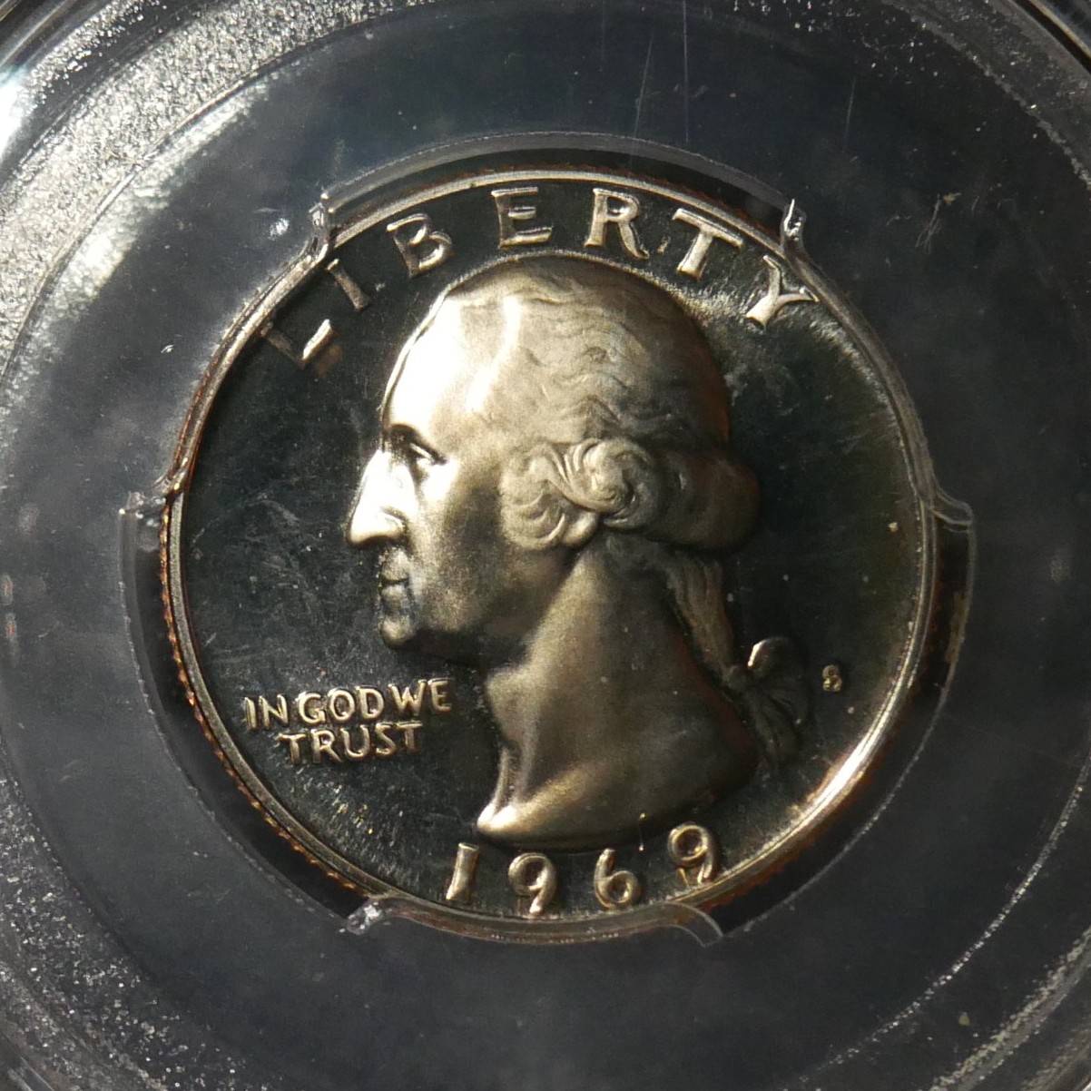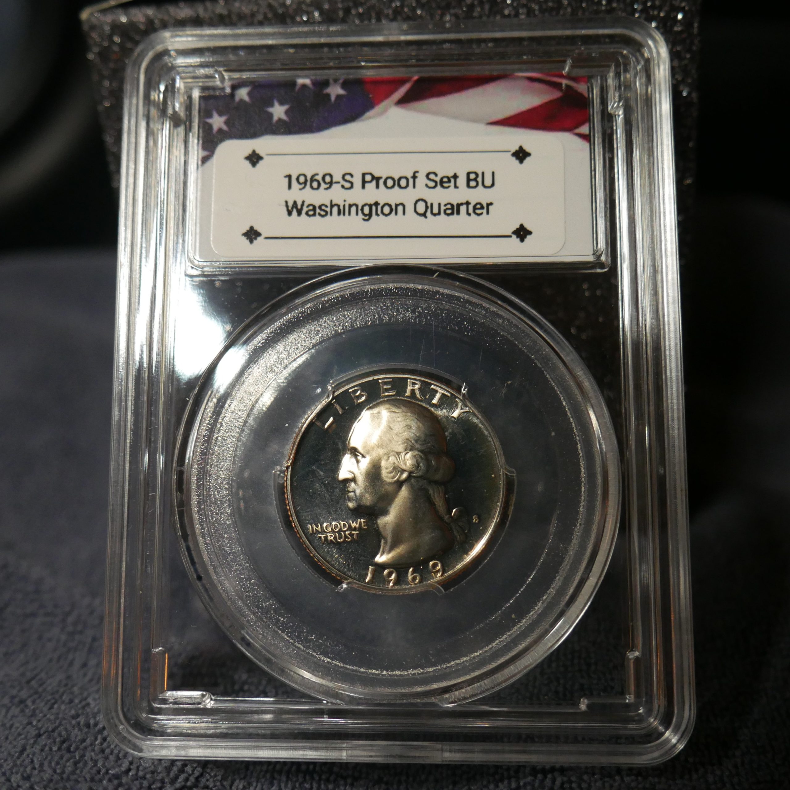 A 1969‑S Proof Washington quarter is a San Francisco–minted, copper‑nickel clad proof coin known for its sharp strike, mirrored fields, and collectible cameo contrasts. Featuring the 1st legendary US president and heraldic eagle with outstretched wings, perched on a bundle of arrows, with olive branches beneath it representing peace. It was produced exclusively as a proof issue, making every 1969‑S quarter a proof coin rather than a circulation strike. Historical Value: Year 1969 signifies the Apollo 11 Landing on the Moon by American astronauts (Neil Armstrong and Edwin “Buzz” Aldrin) and their heroic deeds for the advancement of space exploration as well as George Washington’s contribution toward founding the nation.